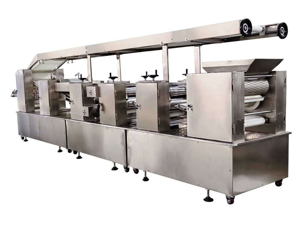 制皮機(jī)為臥式成型機(jī),通過傳送機(jī)構(gòu)將各道軋輥線速度比合理分配,實現(xiàn)從投料到制皮成型自動化生產(chǎn)。適用于餃子皮、餛飩皮、燒麥皮、蒸餃皮、以及燙面類面皮成型。